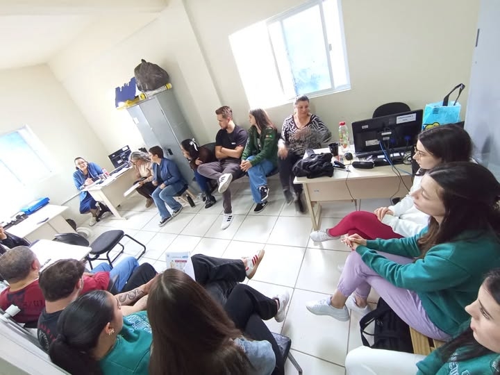 Orientação na UBS do Centro com a equipe do Paternidade. A mediadora Rita Lang e a vice- presidente Micheli Rafaeli falando do trabalho e de que forma os profissionais da saúde podem contribuir com as crianças, adolescentes e as famílias.
